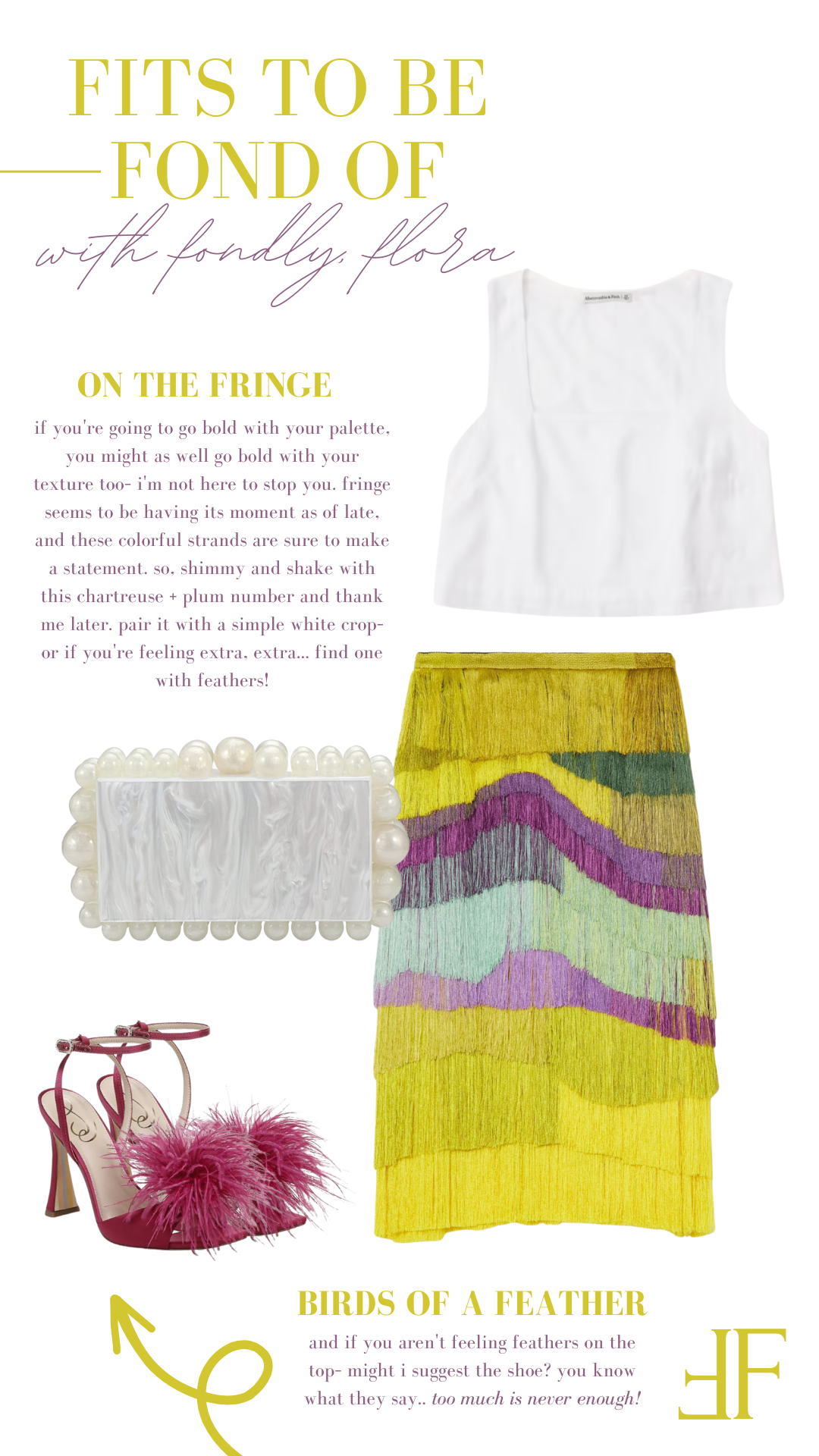 If you’ve been waiting for a sign to be a little extra, this is it—signed, sealed, and fringed. The chartreuse skirt is doing the most in the best way possible, with layers of movement that practically shimmy on their own. Add in those streaks of plum and soft mint, and suddenly you’re not just wearing color—you’re orchestrating it.